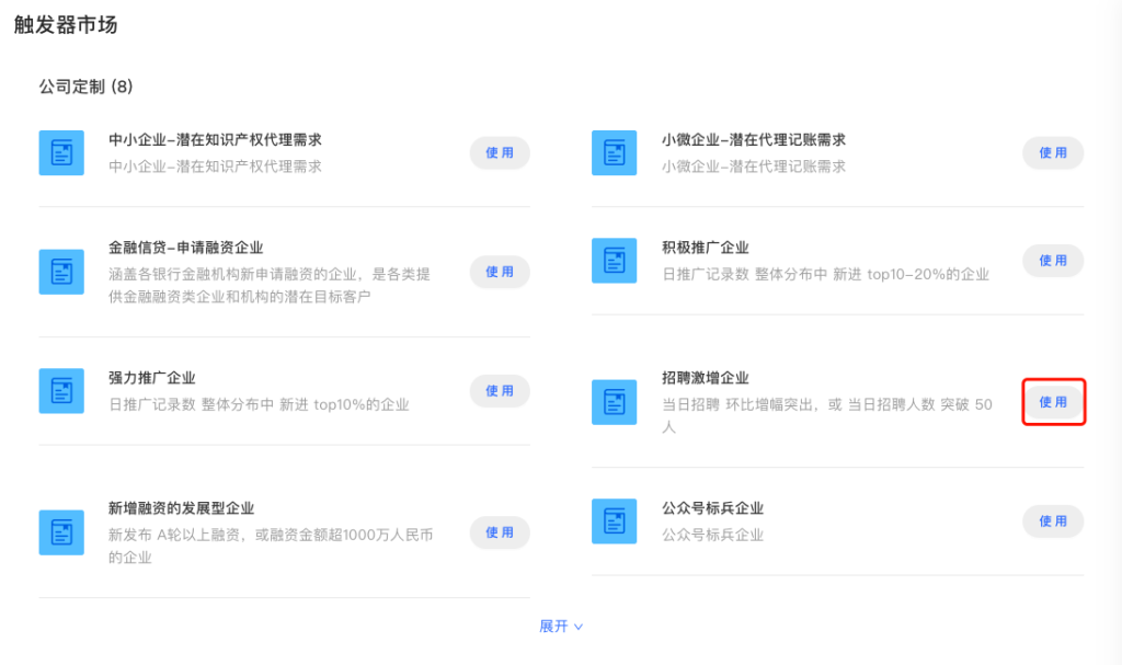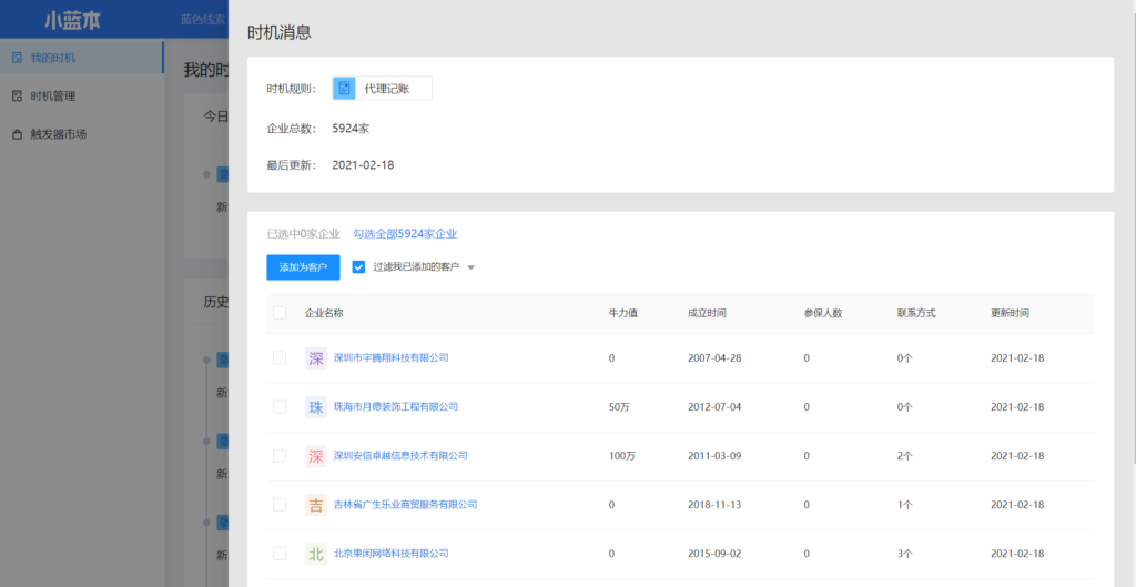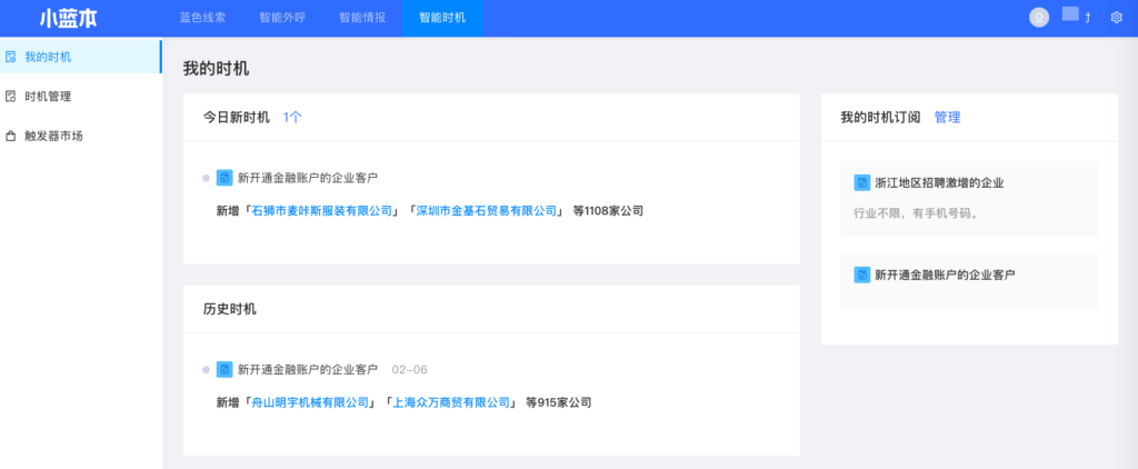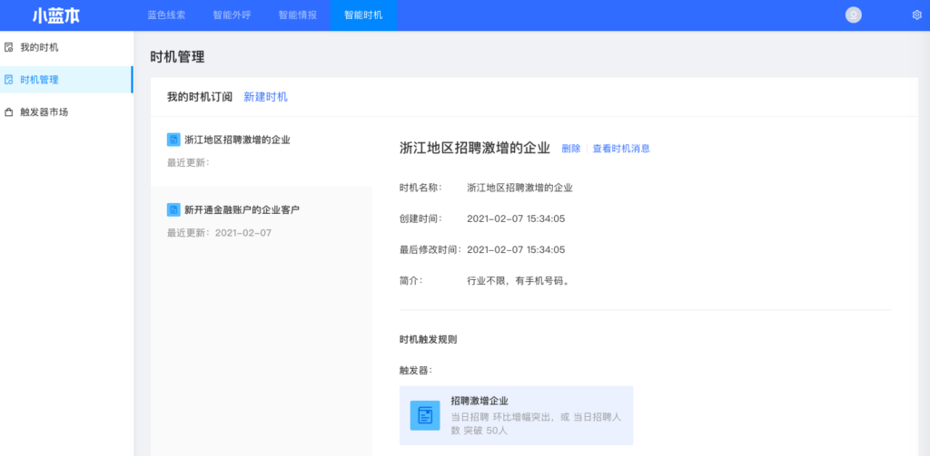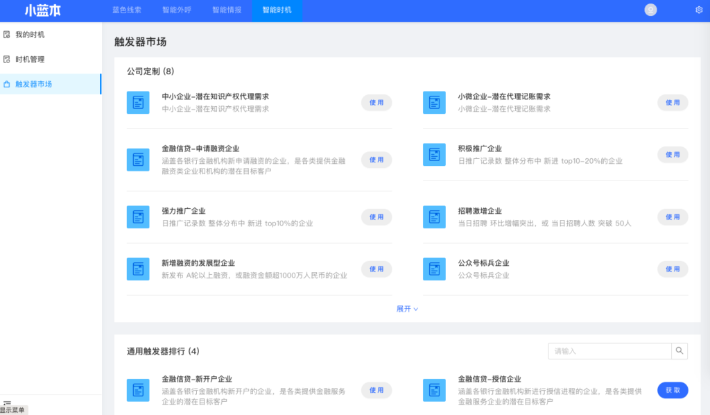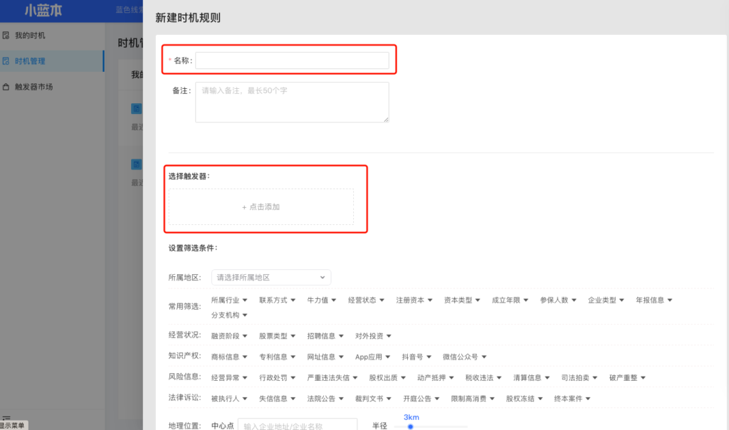 时机提醒受触发器和筛选条件共同作用,触发器可以在触发器市场调用,也可以联系小蓝本定制。当有企业触碰时机规则后,系统会及时提醒销售人员跟进。