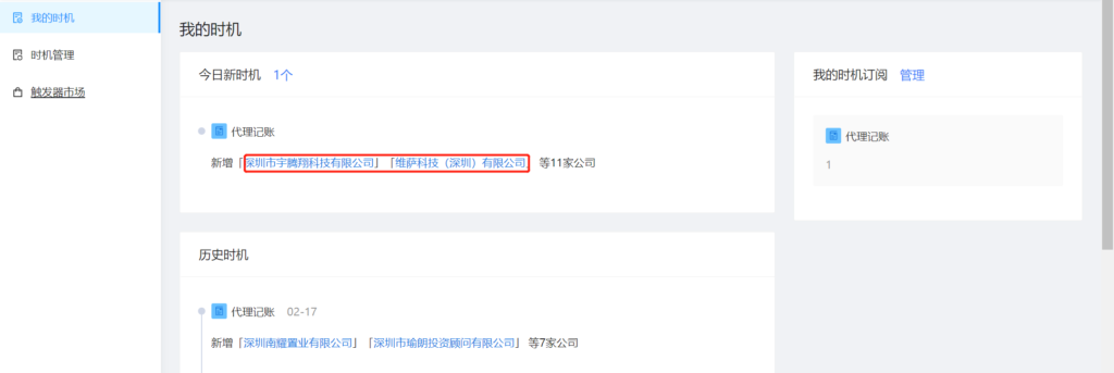 点击进入企业名称进入时机消息后可以将触发时机的企业添加为客户。