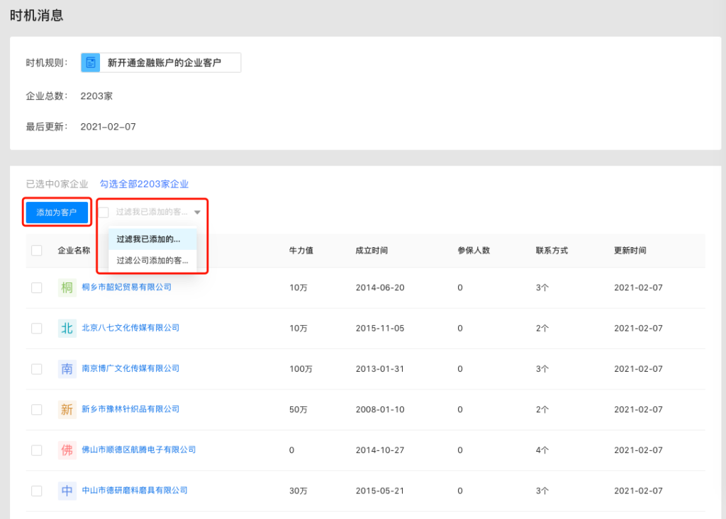 在时机消息页面,点击“勾选全部x家企业”或逐页、逐条勾选,再点击“添加为客户”,即可将企业添加为客户。