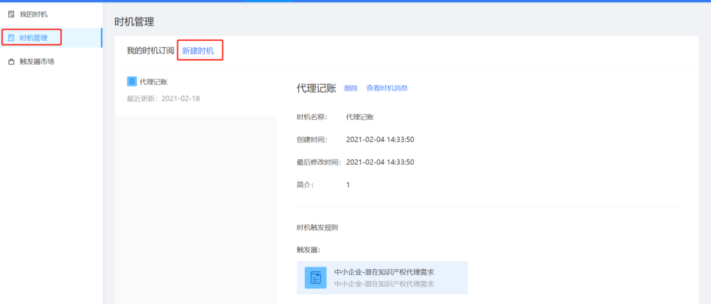 点击右侧“我的时机订阅”的管理按钮可以跳转到时机管理界面。