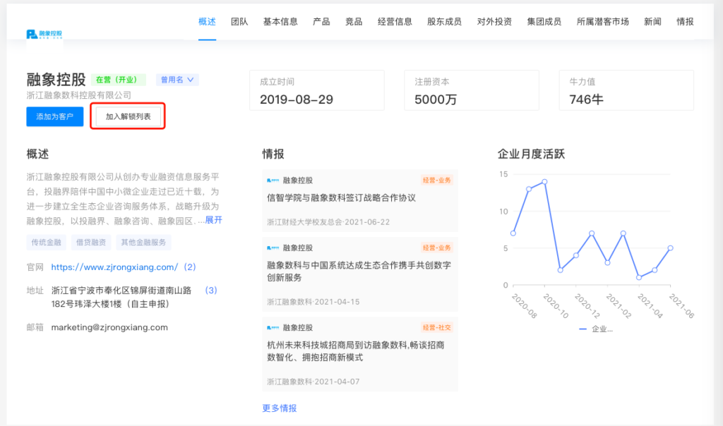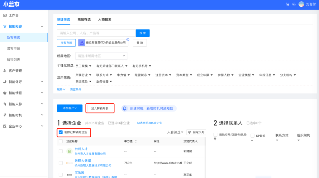 新客筛选,支持批量/单个企业加入解锁列表;