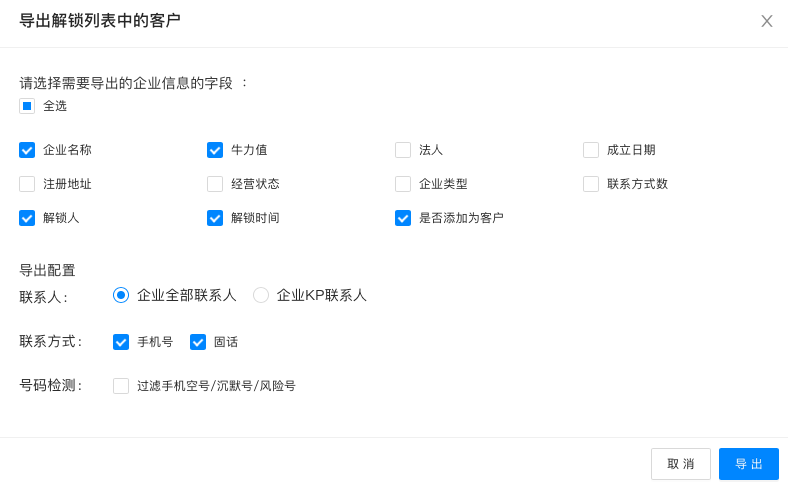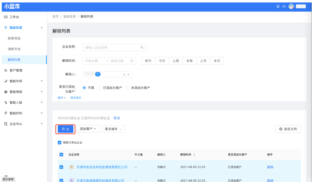 支持按解锁人、解锁日期导出企业基本工商信息、企业全部公开的联系人、KP联系人。