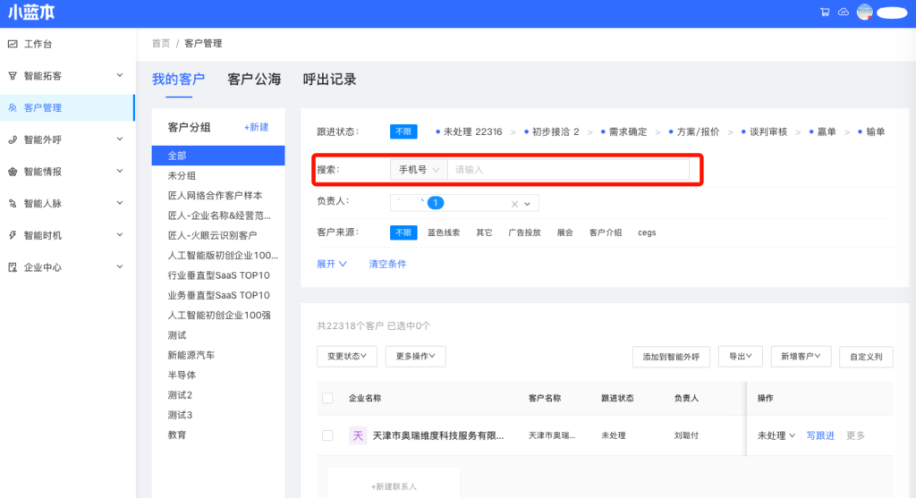销售电话联系客户,可能客户没有接到,之后主动回电。可以通过搜索手机号快速查询是哪个客户,进行有针对性的沟通。