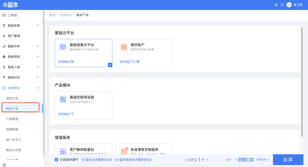 2、商品计费规则:产品模块依赖于智能销售云平台使用,产品模块费用=单个产品模块价格 x(云平台距离过期剩余天数 / 本年度天数)