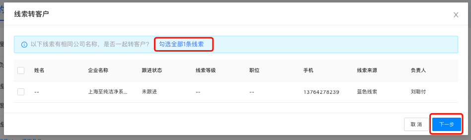 如果有相同企业名称的线索,会提示是否一起转客户,如要一起转,勾选要转的线索,点击【下一步】,进入线索转客户确认页面,线索的联系人会创建为客户的联系人。