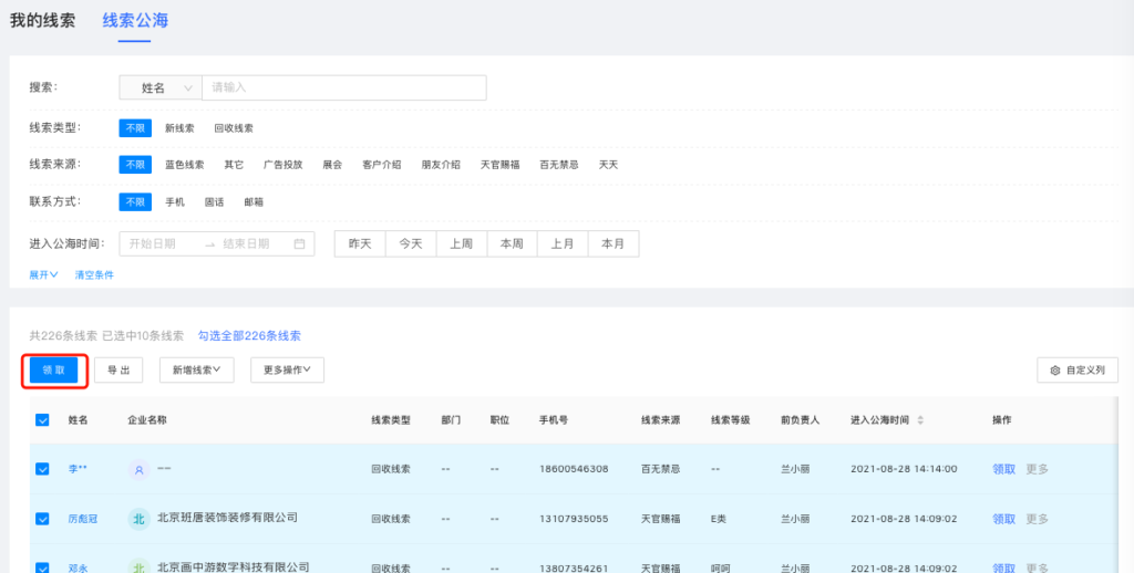 勾选线索,点击【领取】,即可将线索领取到本人名下。