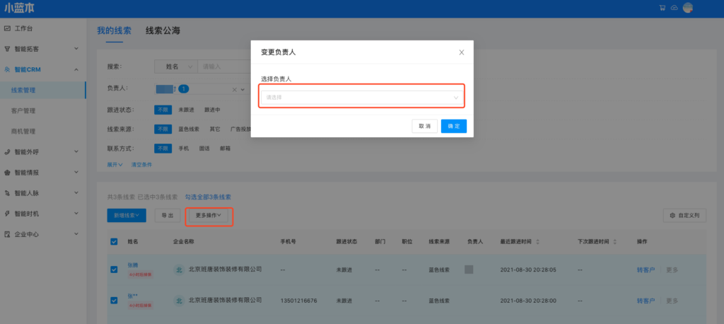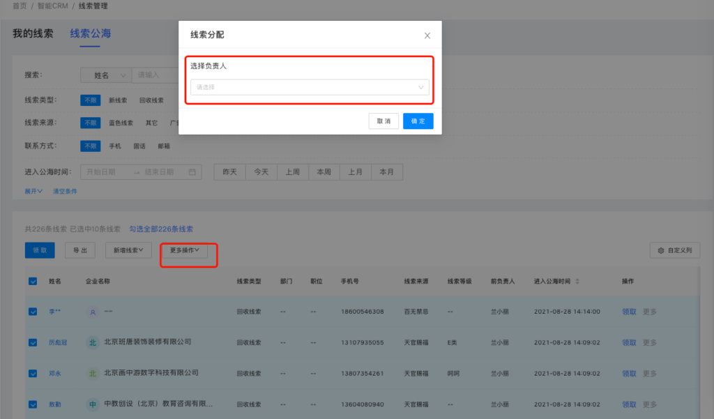 勾选线索,点击【更多操作】,选择【分配】,在弹窗中选择负责人,即可分配线索。