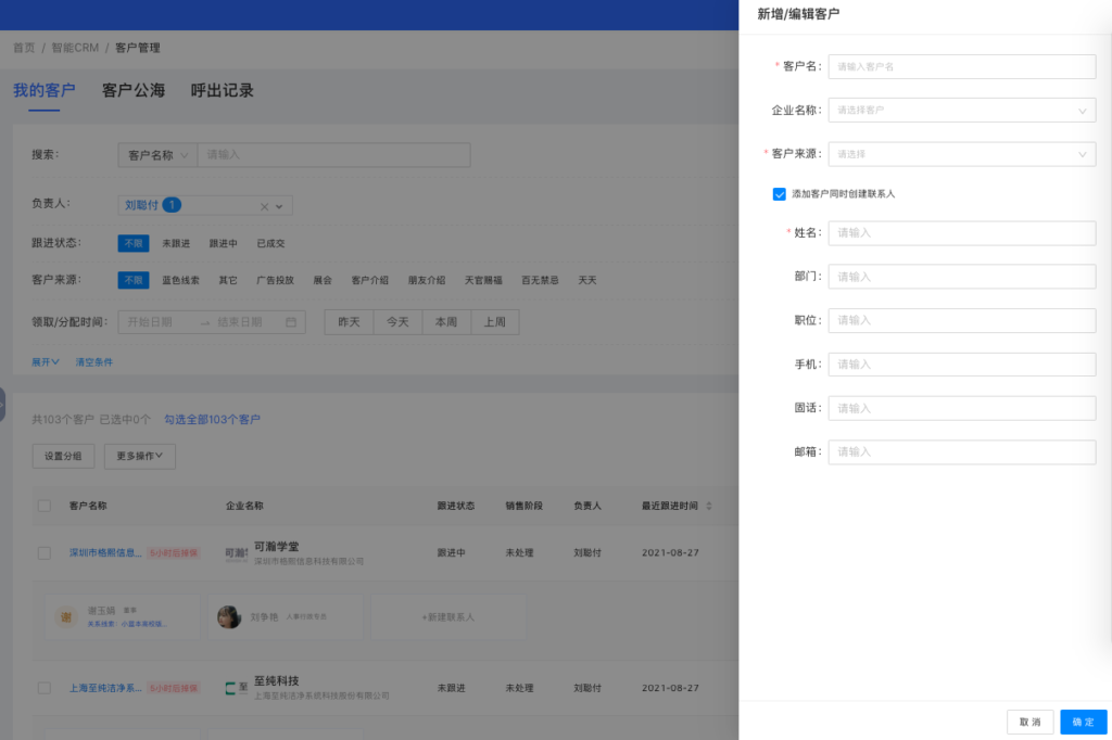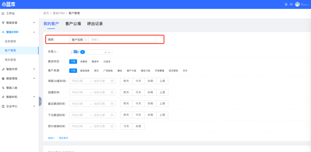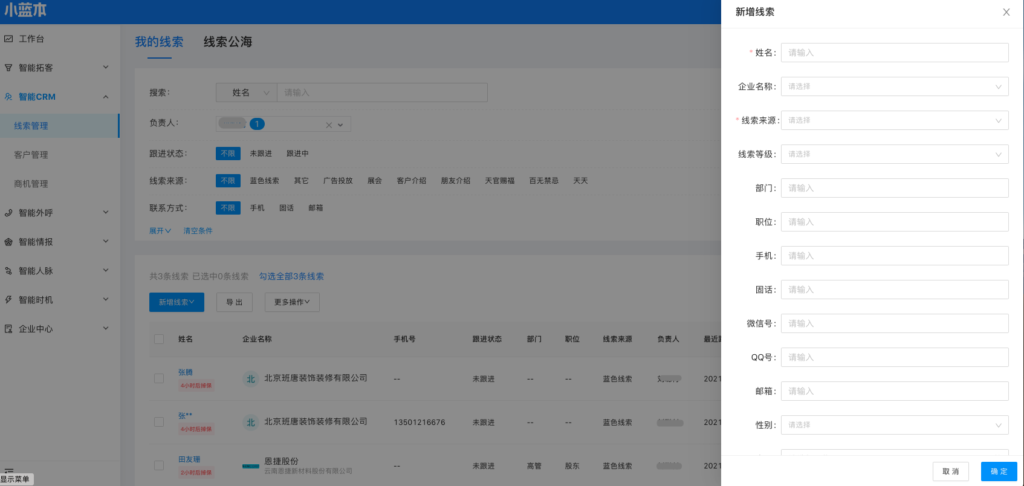 智能CRM包含:线索管理(我的线索、线索公海)、客户管理(我的客户、公海客户)、商机管理。