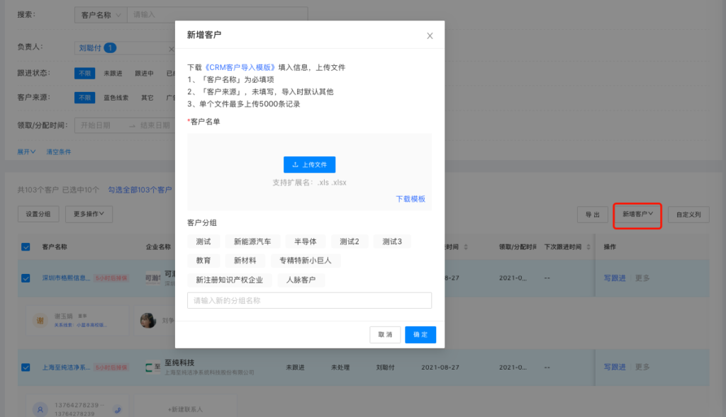 点击【新增客户】,选择【批量导入】,在弹窗中下载客户导入模板,填写信息上传,即可批量导入客户。