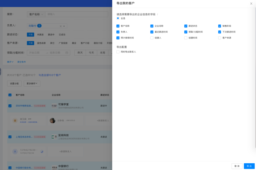 勾选客户,点击【导出】,在弹窗中选择要导出的字段,即可导出客户;如果勾选了【同时导出联系人】,导出客户的同时,也可导出客户的联系人。