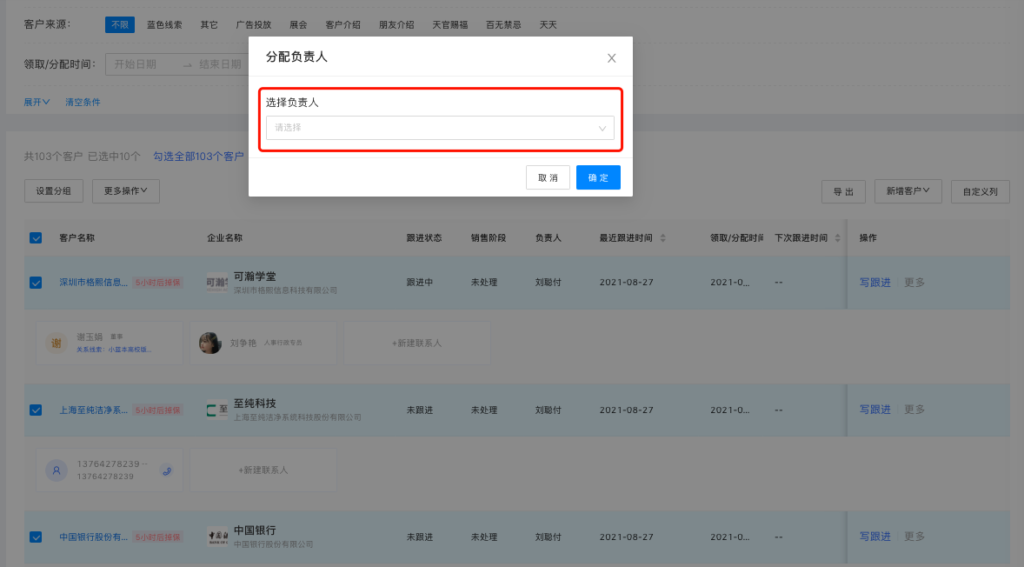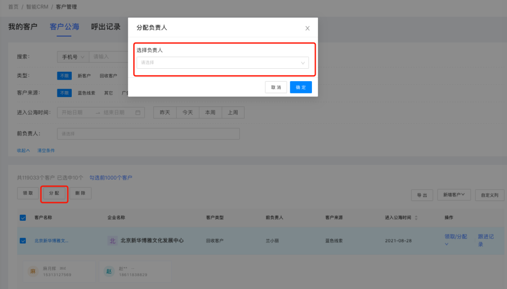 勾选客户,点击【分配】,在弹窗中选择负责人,即可分配客户。