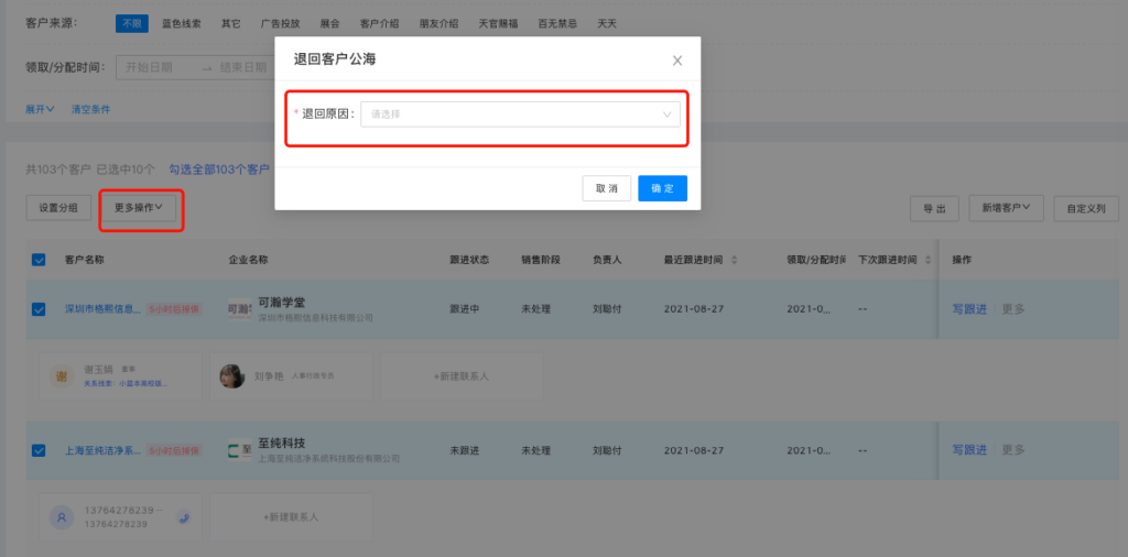 勾选客户,点击【更多操作】,选择【退回公海】,在弹窗中选择要退回公海的原因,即可退回公海。