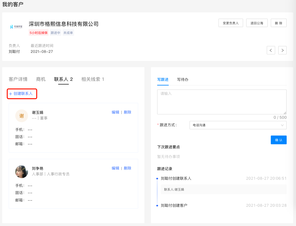 在客户详情页,联系人tab下面点击【创建联系人】,也可新增联系人。