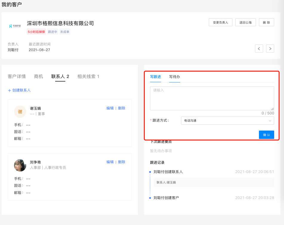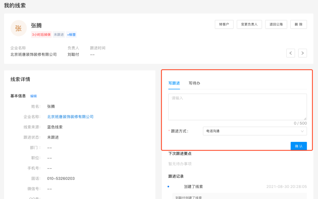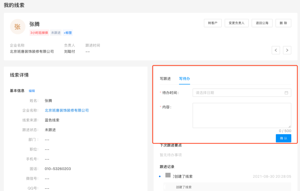 点击【姓名】,进入线索详情页,可以写跟进、写待办。
