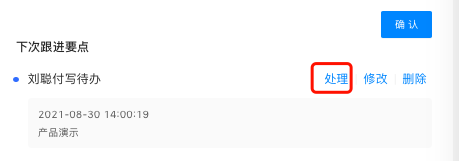 创建待办后,下次跟进要点会有一条待办记录。如已跟进,点击【处理】,可填写待办处理记录。