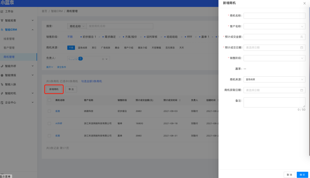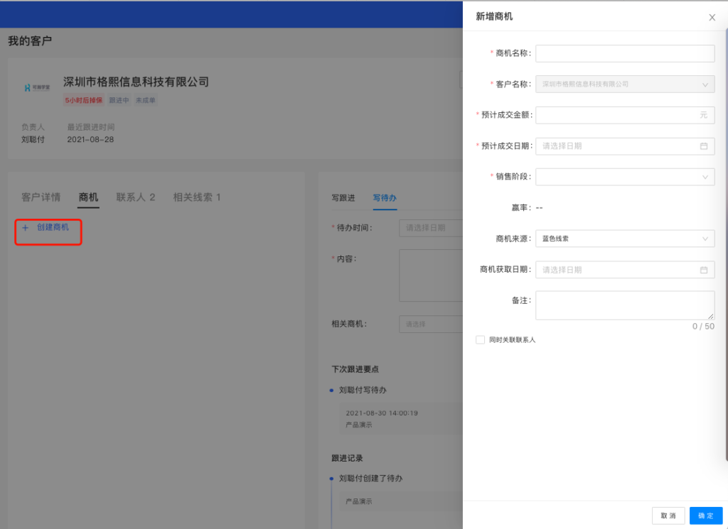 点击【新增商机】,在弹窗中填写商机名称、客户名称、预计成交金额、预计成交日期、销售阶段等,即可创建商机。