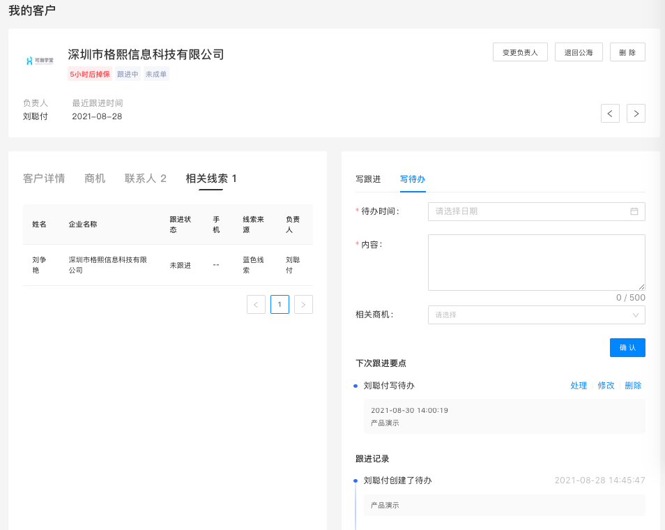 相关线索,是展示本公司所有和该客户相同企业名称的线索,包含:本人跟进的线索、同事跟进的线索、公海的线索。以帮助客户负责人提供更多有价值的信息,促成成单。
