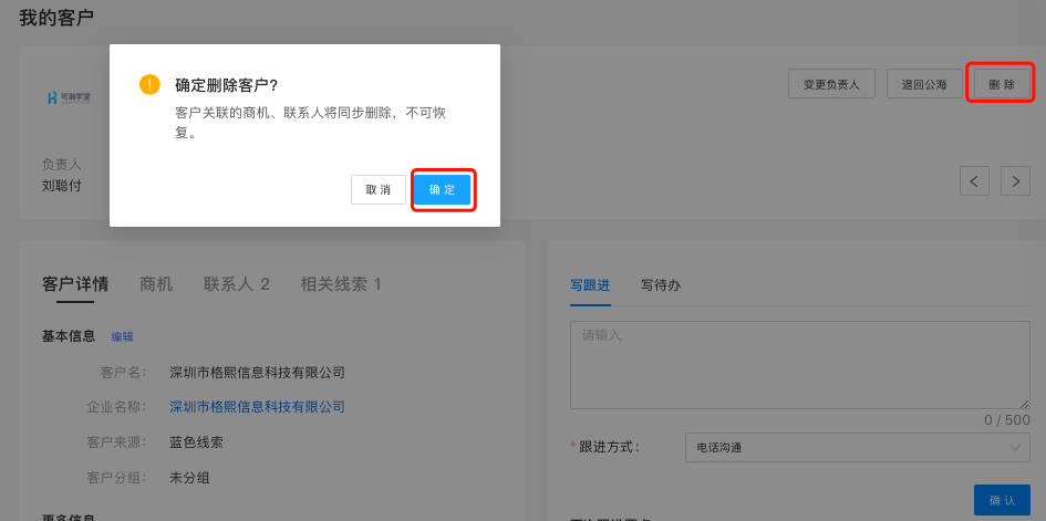 客户删除后,该客户已结束的商机不会删除,未结束的商机会被删除;添加的联系人和跟进记录会被删除。