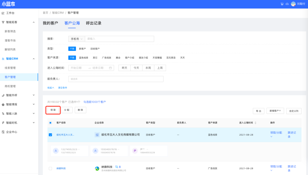 勾选客户,点击【领取】,即可将客户领取到本人名下。
