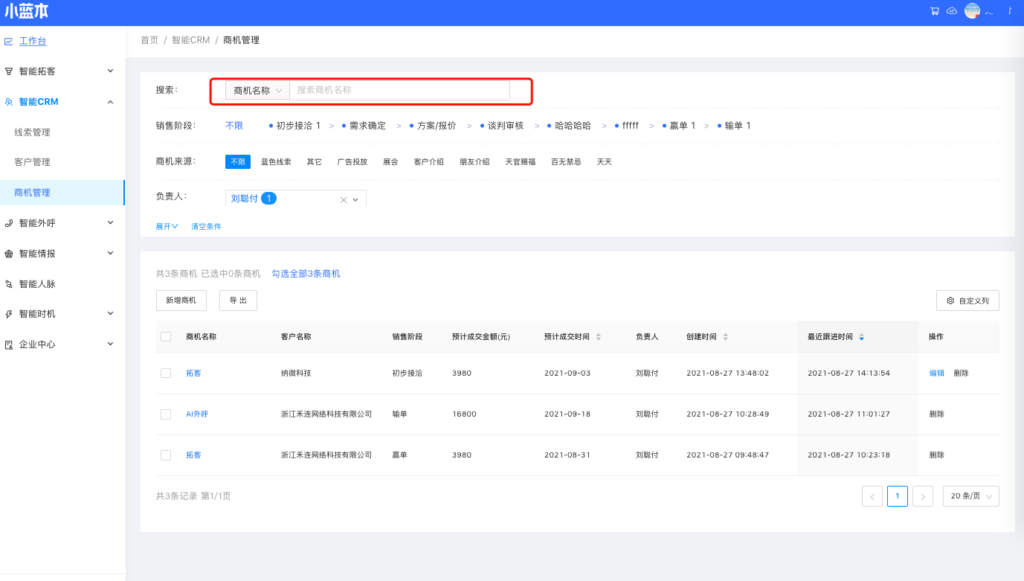 也可以按负责人、销售阶段等查询。负责人默认本人最大数据权限。