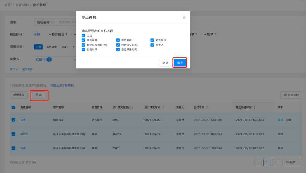 勾选商机,点击【导出】,确认要导出的字段,点击【确定】即可导出商机。