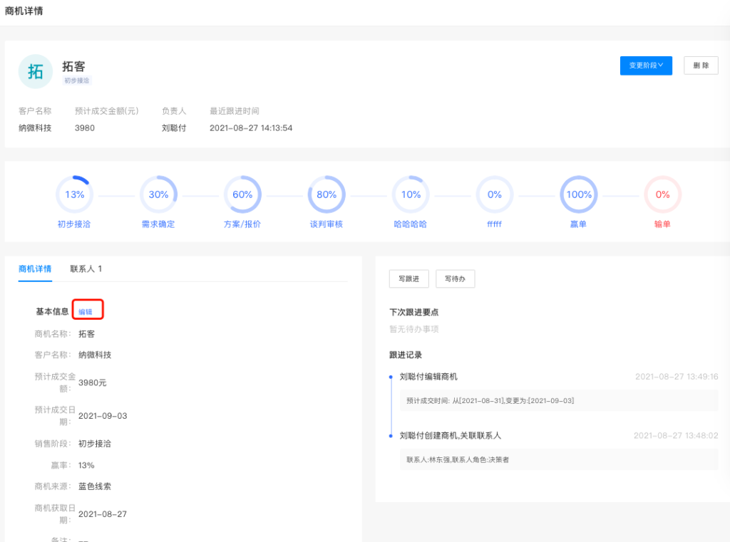 主要功能:新增/编辑商机、导出商机、删除商机、写跟进、写待办、变更销售阶段等。