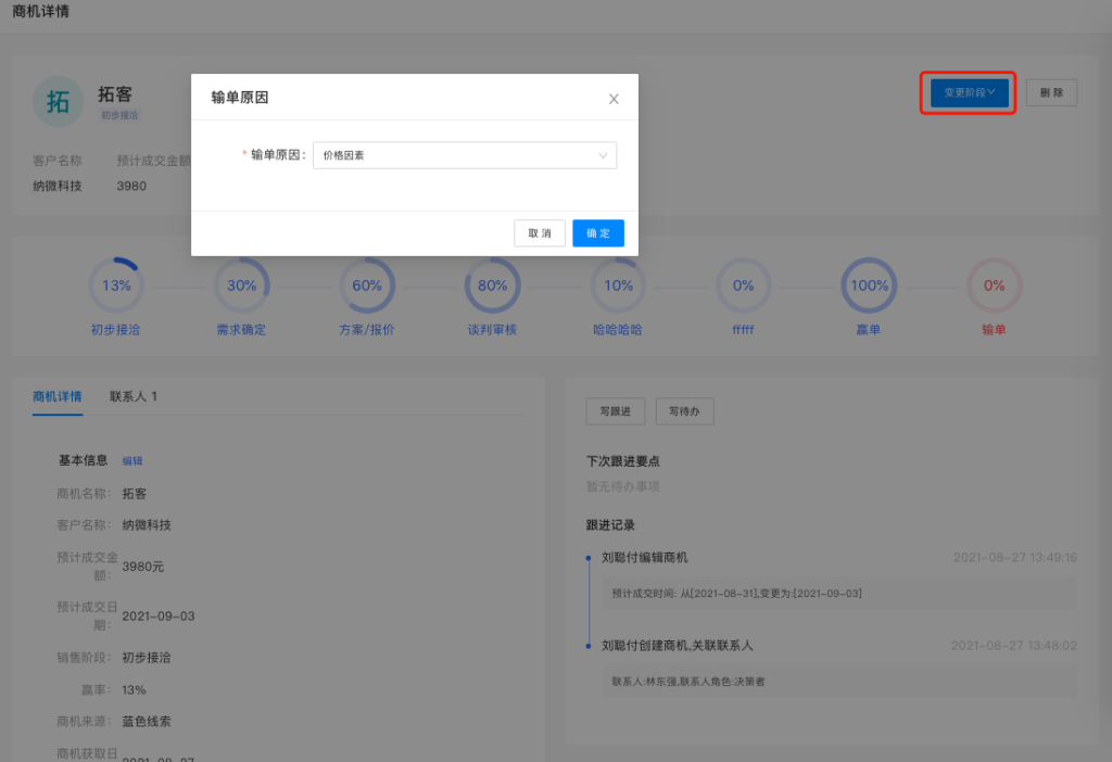 点击【变更销售阶段】,在下拉列表中选择要变更的阶段即可。