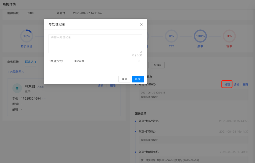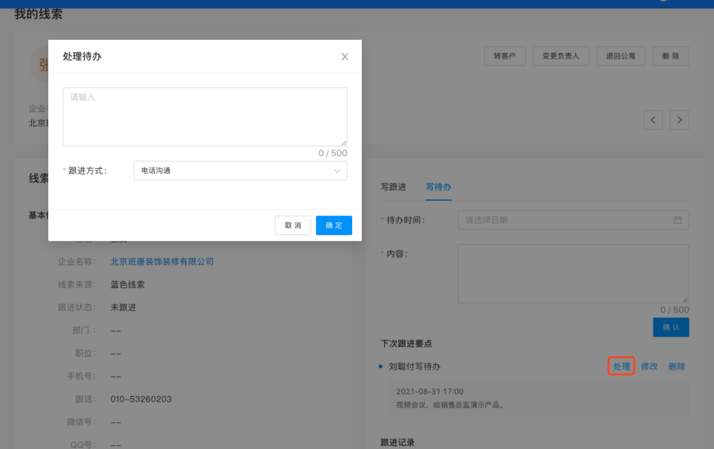 点击待办事项后的【处理】,在处理待办弹窗中输入待办跟进记录、跟进方式,提交之后,会生成一条跟进记录。