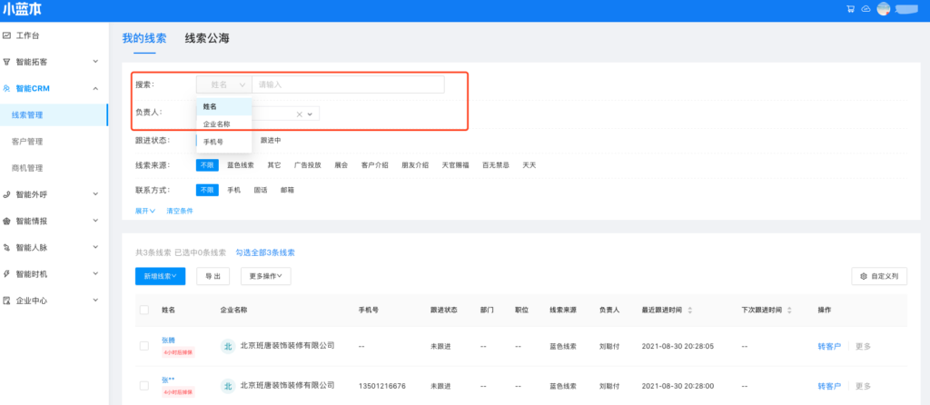 也可以按线索负责人、线索来源、跟进状态、创建时间、跟进时间等查询。
