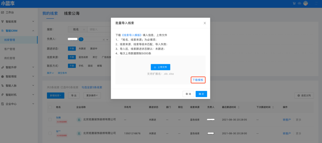 点击【新增线索】,选择【批量导入】,在导入线索弹窗中下载模板,填写好之后上传,即可批量导入线索。