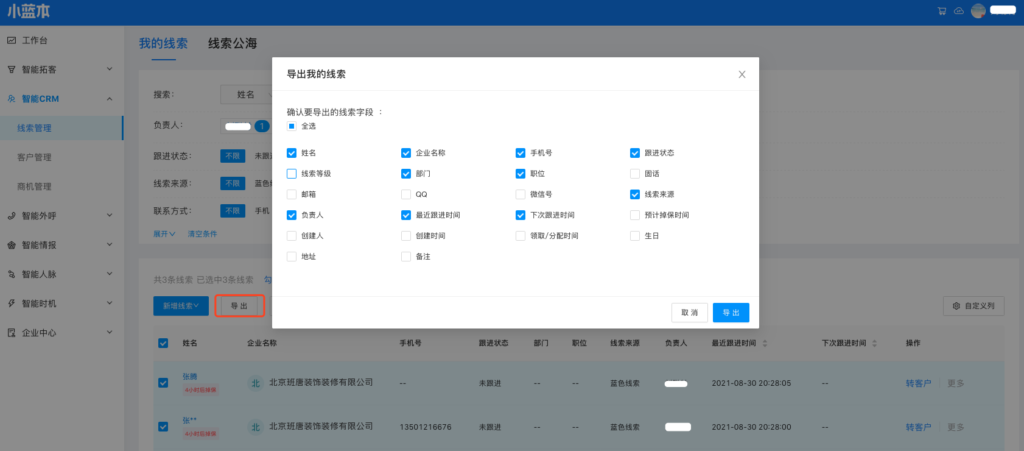 勾选线索,点击【导出】,在弹窗中选择要导出的字段,即可导出线索。