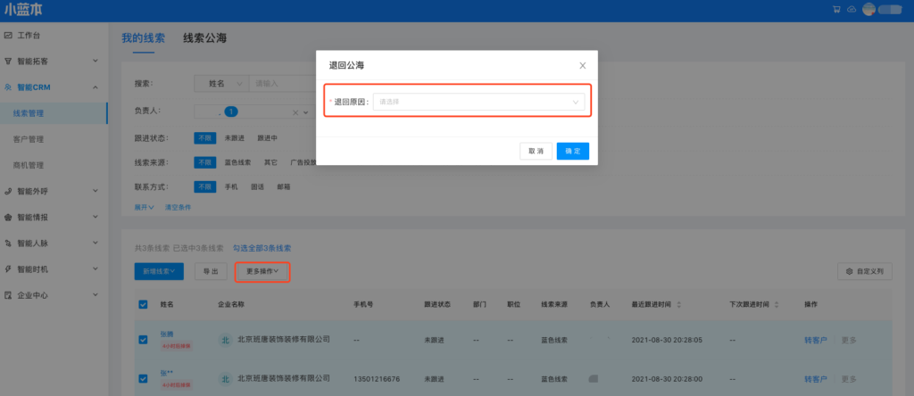 点击【更多操作】,选择【退回公海】,在弹窗中选择退回原因,即可将线索退回公海。