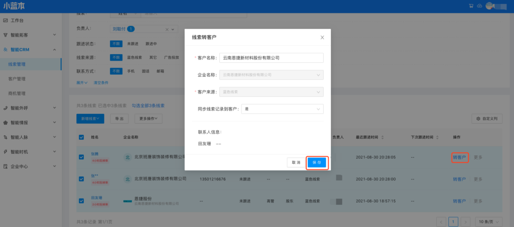 点击【转客户】,在弹窗中确认转客户的信息,可编辑”客户名称“、也可选择是否将线索跟进记录同步到客户,点击”保存“,即可将线索转为客户。