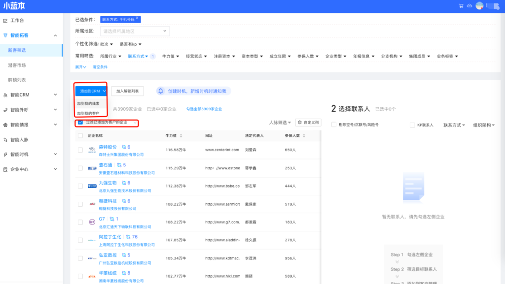 将筛选的企业,批量添加为线索或客户,线索是人的维度,客户是企业的维度。
