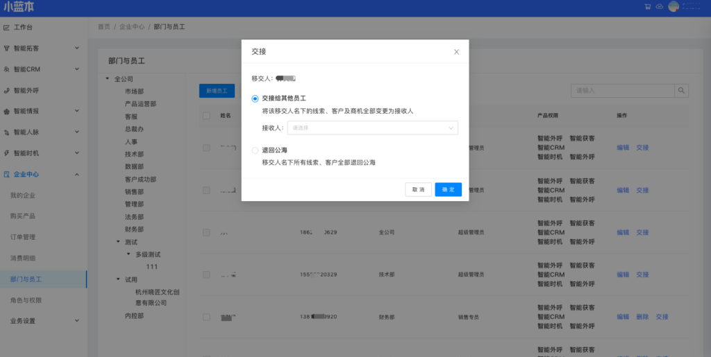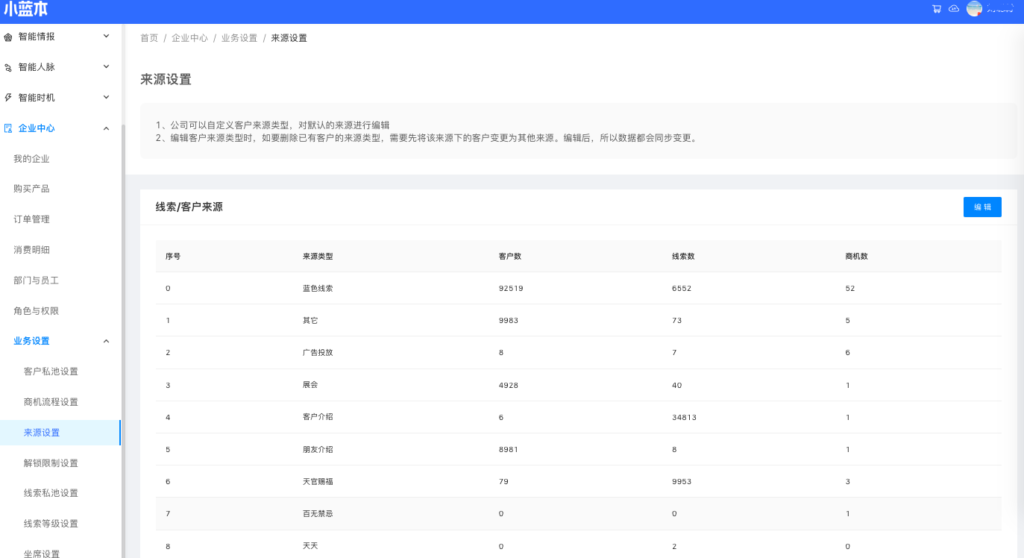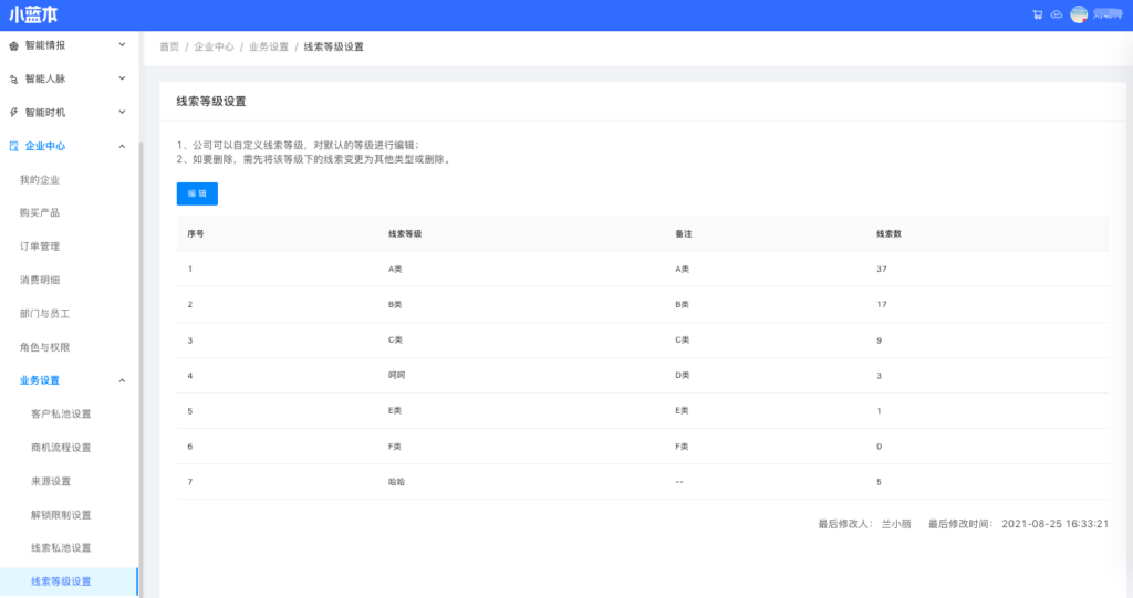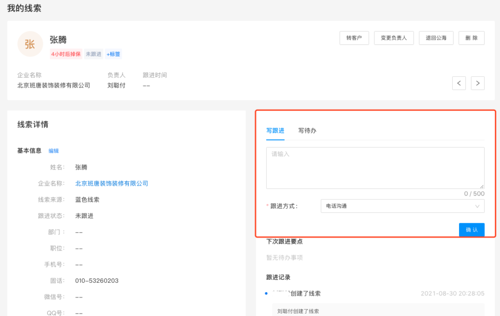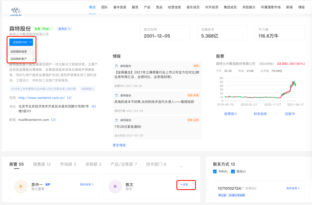 加线索:可以将该企业的相关联系人加为线索;通过小蓝本直接加线索时会根据企业名称、联系方式去重。