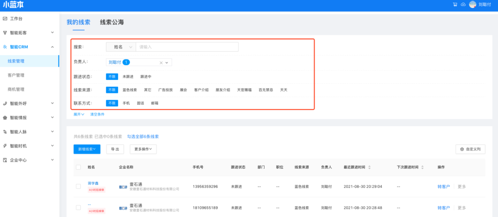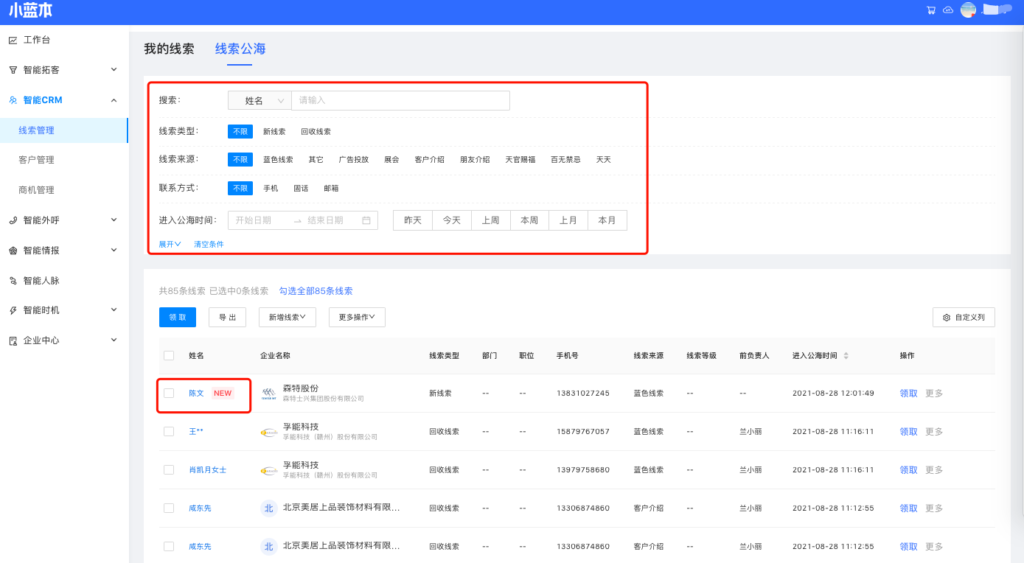 搜索:支持按线索名称、企业名称、手机号搜索;