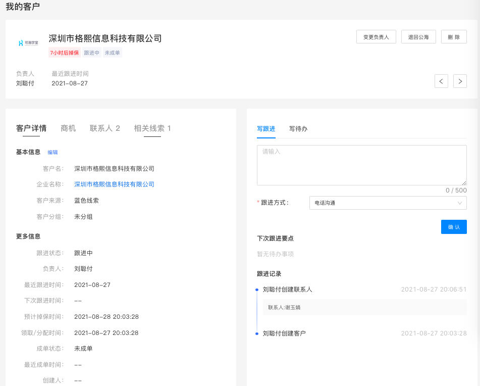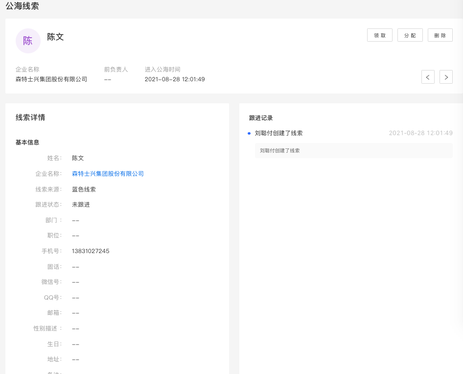 相关线索:可查看该客户所有相关的线索,含本人跟进线索、同事跟进线索、公海线索。