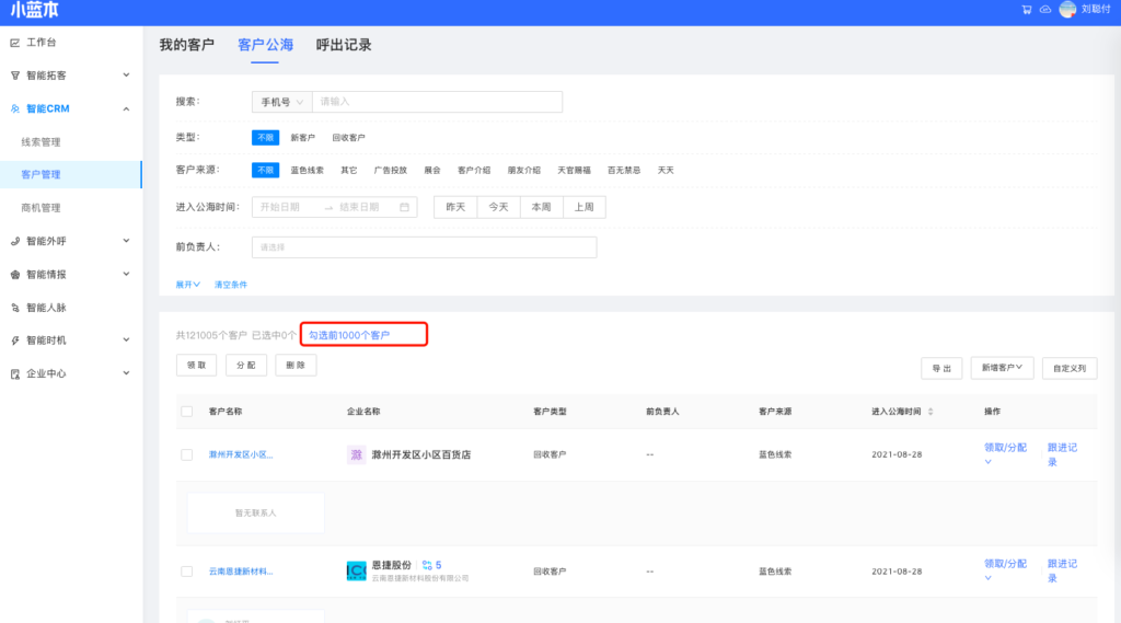 批量操作,可最多勾选前1000家客户进行批量操作;