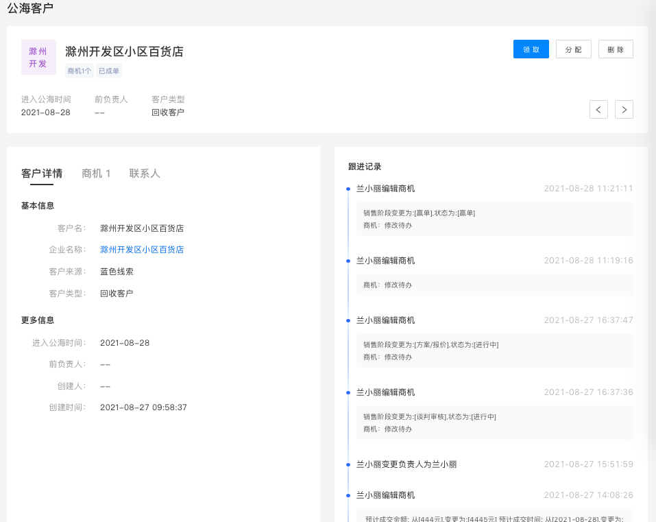 领取:客户领取后,该客户下面原先未结束的商机还可查看、跟进。