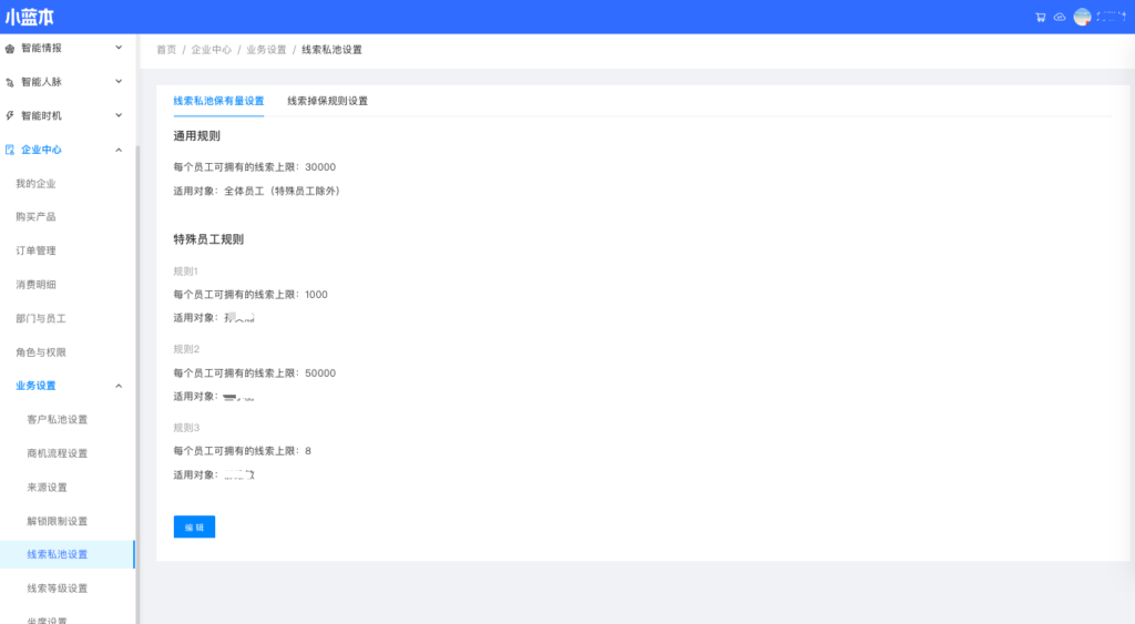 线索私池保有量设置:可以设置员工持有的线索保有量(不含已转客户的线索),超出保有量则不可新增线索;默认:100。
