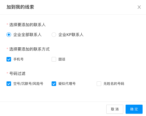 添加线索时,可选择企业全部联系人或KP联系人、过滤空号/沉默号/风险号、疑似代理号等。