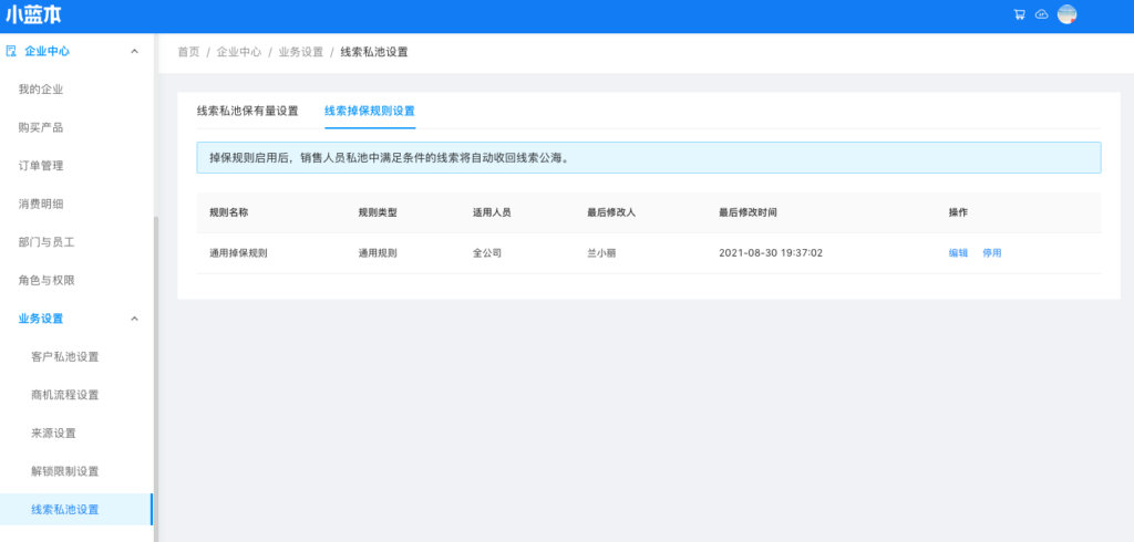 线索掉保规则设置:可设置线索掉保规则,如:x天未跟进、x天未成交。默认不开启。