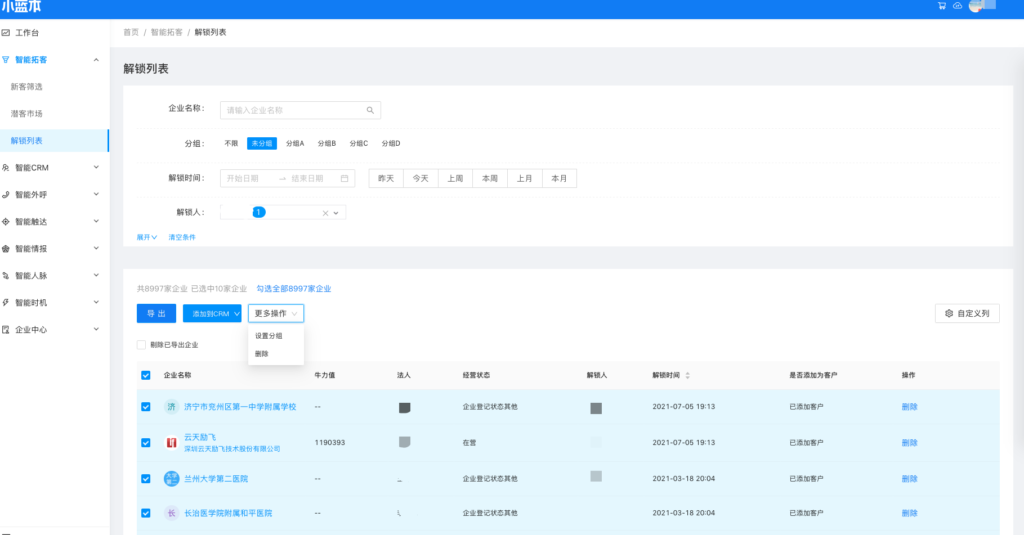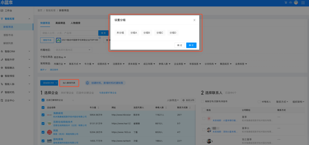 公司可以统一设置分组名称,销售人员解锁企业时,可以设置分组。