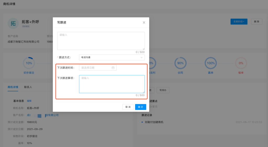 在写跟进弹窗,写完跟进记录,可同时填写下次跟进时间和跟进事项。