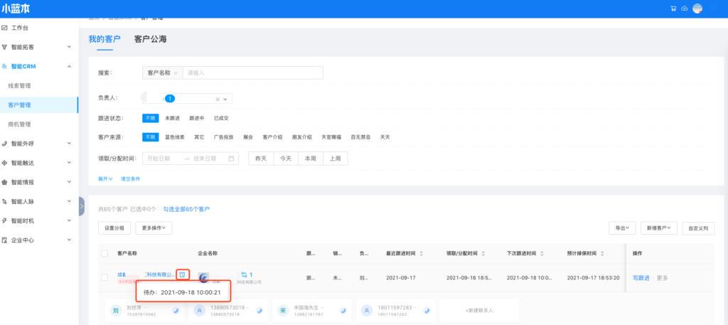 在列表中查看跟进中的线索、客户、商机时,有待办事项的客资一目了然。