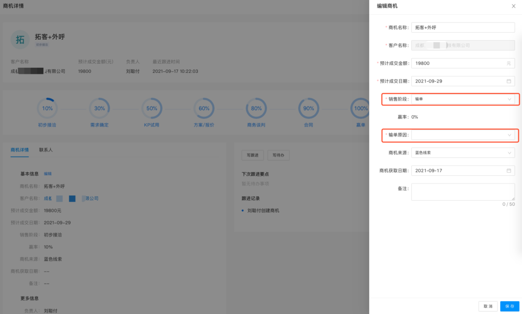 (3)编辑商机时,阶段变更为【输单】,需要填写输单原因;