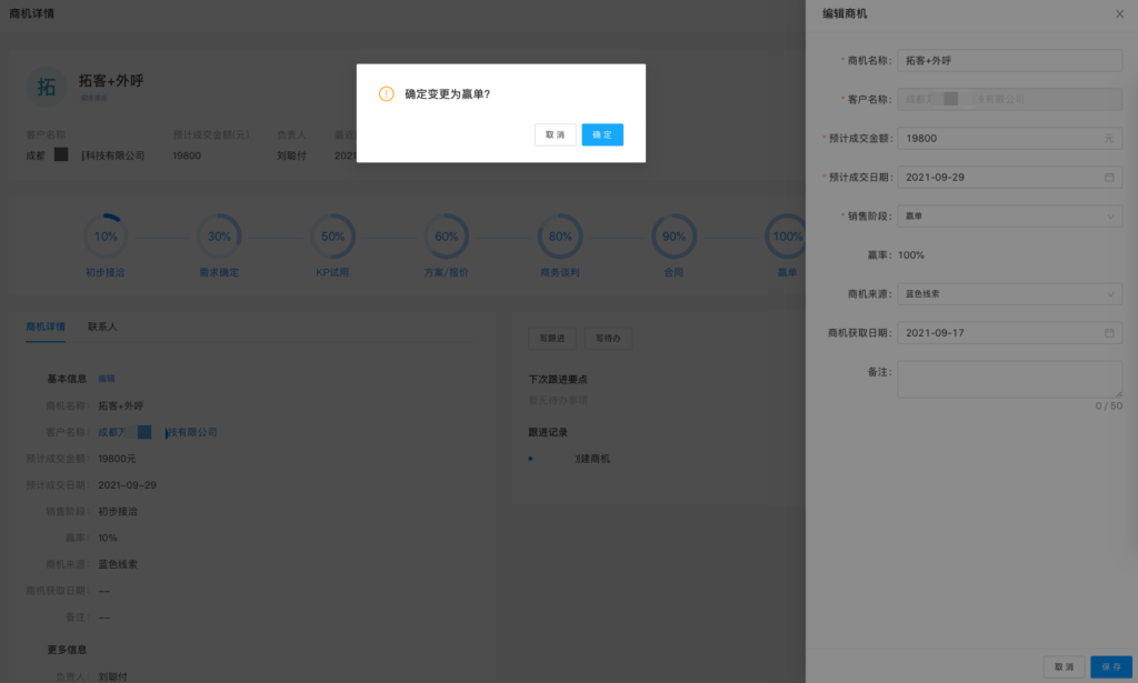 编辑时,销售阶段变更为“赢单”,需要二次确认,避免误操作。