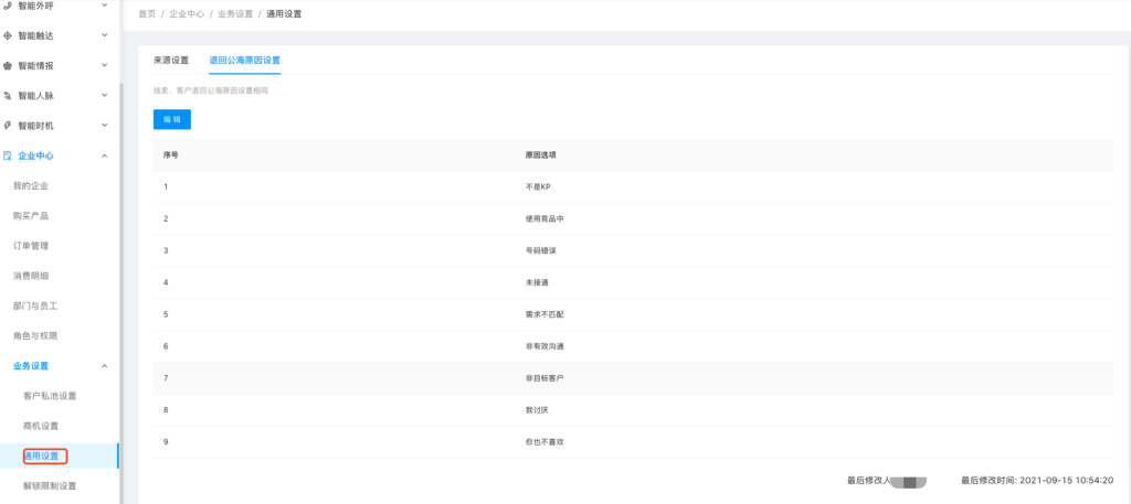 【企业中心】-【业务设置】-【通用设置】-【退回公海原因设置】,可以新增/编辑/删除线索、客户退回公海的原因。