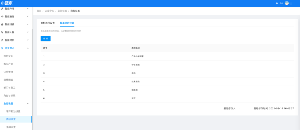 【企业中心】-【业务设置】-【商机设置】-【输单原因设置】,可以新增/编辑/删除商机输单的原因。