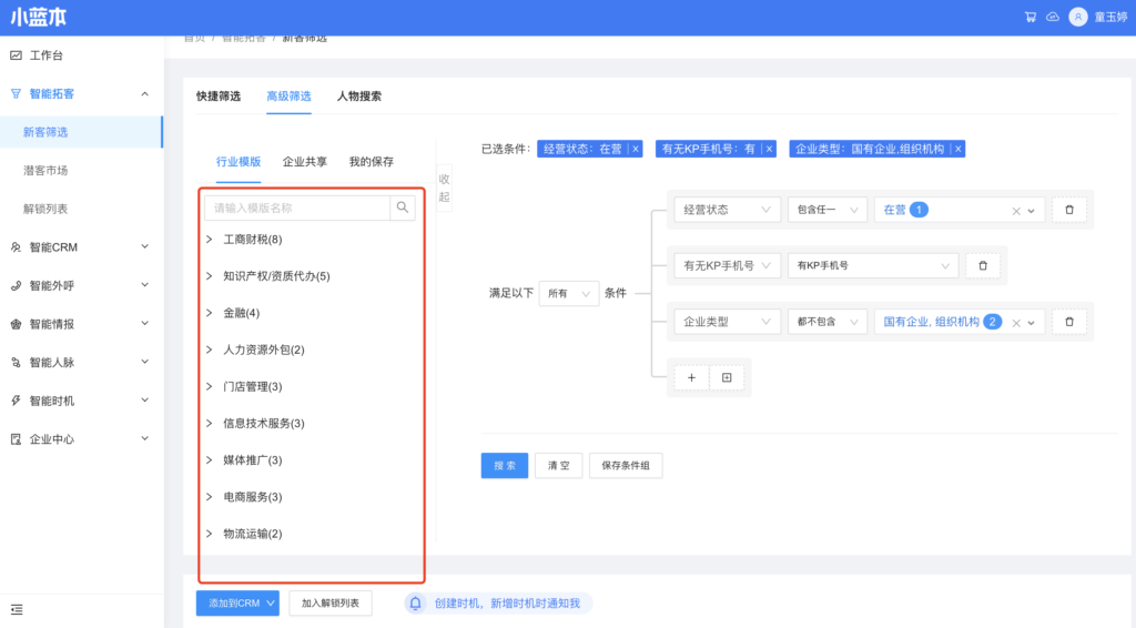 【价值】用户可以直接选用行业模板,快速筛选目标潜客